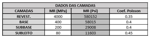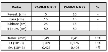 O Quadro 1 apresenta as propriedades dos materiais considerados, e o Quadro 2 as espessuras utilizadas para cada pavimento, mantendo-se a espessura equivalente de material granular, e os resultados da análise. Foi utilizado o Software ELSYM 5 de análise elástica não linear para análise mecanística avaliando deslocamento no topo do revestimento, tração na fibra inferior do revestimento e compressão no topo do subleito, sob carregamento de um eixo padrão de 80 kN e pressão de enchimento dos pneus de 0,55 MPa.