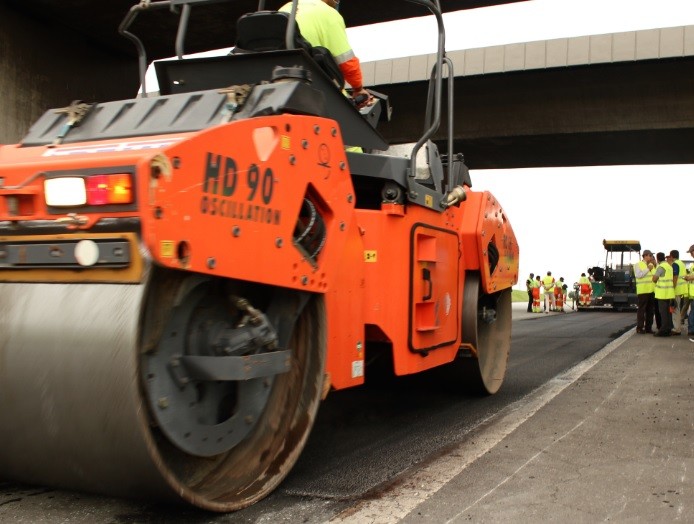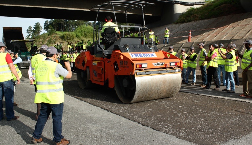 6) Pavimentação e compactação final de uma camada asfáltica de rolamento. Mistura do tipo SMA com 3 centímetros de espessura.