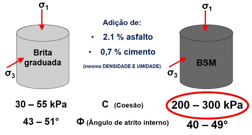 Outra grande qualidade do BSM é a significativa melhoria das características físicas dos materiais granulares já existentes na pista, adicionando espuma de asfalto e cimento em pequenas quantidades. Um exemplo de uma amostra de material comprovou em ensaios de laboratório que seu valor de coesão aumentou em mais de 6 vezes, assim melhorando também sua resistência ao cisalhamento.