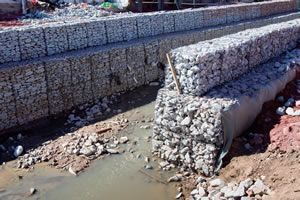 Descrição: gabiões são compostos por gaiolas de aço zincado de malha hexagonal e preenchidas com pedras com peso entre 2 kg e 5 kg. É uma das técnicas de contenção mais utilizadas, por ser de fácil execução, ter baixo custo e se integrar bem ao meio ambiente. Monolíticos, com elevada permeabilidade e boas condições de acomodação em deslocamentos, são usados em muros de contenção, proteção de margens e canalização de córregos. Há três tipologias principais. O gabião caixa, em formato de paralelepípedo, é mais usado como muro. Utilizado para o revestimento das margens e de leitos de cursos d’água, o gabião colchão também tem formato de paralelepípedo, mas pequena espessura. Já o gabião cilíndrico (ou saco) é constituído de um único pano de tela de forma retangular que é enrolado, assumindo a forma cilíndrica. É utilizado em obras emergenciais.